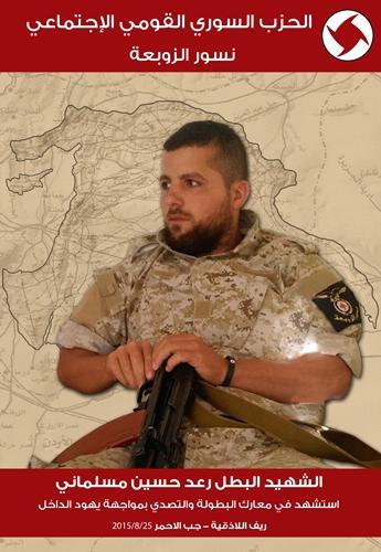 يزفّ الحزب الى الأمة وعموم السوريين القوميين الاجتماعيين في الوطن وعبر الحدود، الرفيق رعد حسين المسلماني شهيداً أثناء تأديته واجبه القومي. والشهيد من مواليد جديدة الفاكهة ــ البقاع الشمالي 1990، عازب. انخرط في صفوف الحزب عام 2011، وخضع لدورات وعسكرية عدة، ونفذ العديد من المهام الحزبية، وشارك ضمن تشكيلات نسور الزوبعة في العديد من المعارك بمواجهة قوى الإرهاب والتطرف وداعميها. تميّز الشهيد باندفاعه ومناقبيته وشجاعته. وكان مثالاً للقومي الاجتماعي المقدام. استشهد بتاريخ 25/8/2015، في منطقة جب الأحمر ــ ريف اللاذقية، خلال مشاركته في المعارك الضارية بمواجهة المجموعات الإرهابية المتطرفة. إنّ الحزب السوري القومي الاجتماعي إذ يزّف الرفيق رعد المسلماني، الذي روى بدمائه الزكية تراب الأمة، فإنه يؤكد التمسك بخيار المقاومة والصراع ضدّ أعداء الأمة. إنّ استشهاد الرفيق رعد المسلماني على أرض الشام الحبيبة، يؤكد على قومية المعركة ضدّ الاحتلال والإرهاب والتطرف وضدّ مشاريع التقسيم والتفتيت والتدمير التي تستهدف امتنا. ويشدّد الحزب السوري القومي الاجتماعي على أنّ بذل الدماء والتضحيات دفاعاً عن أرضنا وعن شعبنا، واجب قومي لن نتأخر عن القيام به، مهما كان حجم المخاطر والتحديات. فنحن أصحاب حق، وأصحاب قضية تساوي كلّ وجودنا. ولن نحيد عن خياراتنا، وسنعمد بالدم مسيرتنا الصراعية بالتحالف المعمد بالدم مع الجيش السوري وقائده العام الرئيس الدكتور بشار الأسد. تحية لشهيدنا البطل ولكلّ الشهداء الأبطال. والبقاء للأمة