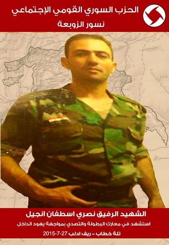 يزفّ الحزب إلى الأمة وعموم السوريين القوميين الاجتماعيين في الوطن وعبر الحدود الرفيق نصري اسطفان إنجيل شهيداً أثناء تأديته واجبه القومي في مواجهة القوى الإرهابية المتطرفة. والشهيد من مواليد القلاطية ـ الحصن عام 1978، متزوّج وله ولدان. فُقد الاتصال به في معركة تلة خطاب في ريف إدلب بتاريخ 27 تمّوز 2015، ويزفه الحزب شهيداً بعد التأكد من استشهاده. انّ الحزب إذ يعبّر عن اعتزازه بشهدائه الذين يبذلون دماءهم الزكية في سبيل الدفاع عن أرضنا وشعبنا، يؤكد استمراره إلى جانب الجيش السوري والقوى الحليفة في مقاومة الإرهاب والتطرف على امتداد الجغفرافيا السورية. ويشدّد الحزب على أنّ خيار الدفاع عن شعبنا وأمتنا ينبع من صلب عقيدتنا ومبادئنا، لذلك سيكون القوميون الاجتماعيون حيث يجب أن يكونوا في كلّ المواقع النضالية يمتشقون السلاح مع الجيش السوري والحلفاء حتى تحقيق النصر وهزيمة الإرهاب. هذا ويُقام للشهيد قداس وصلاة لراحة نفسه يوم السبت في 29/8/2015 في تمام الساعة الحاية عشرة قبل الظهر، وذلك في كنيسة مار يوحنا المعمدان في القلاطية. وتقبل التعازي في صالة كنيسة مار يوحنا المعمدان في القلاطية ايام الأحد والإثنين و الثلاثاء الواقع في 30-31/8/2015 و1/9/2015. والبقاء للأمة.