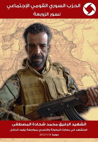 يزفُّ الحزب إلى الأمة وعموم السوريين القوميين الاجتماعيين في الوطن وعبر الحدود خبر إستشهد الرفيقين ابراهيم الطبل ومحمد المصطفى أثناء تأديتهما واجبها القومي. ـــ الشهيد الرفيق ابراهيم محمد الطبل من مواليد مخيم الوافدين 6/1/1979، انتمى الى الحزب في 30/10/2009، شارك في العديد من المعارك ضمن تشكيلات نسور الزوبعة، وكان مقداماً وشجاعاً، مثالاً للقومي الاجتماعي المضحّي في سبيل حزبه وشعبه وأمته. ــــ الشهيد الرفيق محمد شحادة المصطفى من مواليد دوما 30/7/ 1974، إنتمى الى الحزب عام 2011 وانخرط في تشكيلات نسور الزوبعة في العام 2012، ليخوض العديد من المعارك والمواجهات ضد قوى الإرهاب والتطرف، وكان مقداماً وشجاعاً، مثالاً للقومي الاجتماعي المضحّي في سبيل حزبه وشعبه وأمته. استشهدا اليوم، في مواجهة قوى الإرهاب والتطرف عند تخوم مدينة دوما، حيث كانا الى جانب رفقائهما وبواسل الجيش السوري يشاركان في معركة تحرير دوما من الإرهاب. إنّ الحزب السوري القومي الاجتماعي إذ يعبّر عن اعتزازه بشهدائه الأبطال، ويُحيّي شجاعة وإقدام الشهيدين الرفيقين ابراهيم الطبل ومحمد المصطفى، يؤكد المضيّ في مسيرة النضال والصراع حتى التخلّص نهائياً من مجموعات الإرهاب والظلام والتطرّف التي تتهدّد بلادنا وشعبنا. ويشدّد الحزب على أنّ الحرب ضدّ الإرهاب والتطرف هي حرب وجود ومصير، تماماً كما هي الحرب ضدّ العدو الصهيوني حرب وجود ومصير، لأنّ الاثنين وجهان لمؤامرة واحدة تستهدف أمتنا بتاريخها وحضارتها ومستقبلها، ولذلك نجدّد العهد والوعد للشهداء بأننا على الدرب سائرون، ولن نبخل بأيّة تضحيات دفاعاً عن بلادنا وشعبنا وعن وحدة نسيجنا الاجتماعي. إنّ شهداؤنا هم طليعة انتصاراتنا الكبرى، وبدمائهم يبزغ فجر النصر والحرية، ويتبدّد ظلام الإرهاب والصهيونية والاستعمار. عهداً للشهداء أنّ نستمر في مسيرة الصراع والمقاومة، ضد كل محتل وضد كل ارهابي وضد كل متآمر، وان صبح النصر آت لا محال. يشيع الشهيدين يوم الخميس 12 تشرين الثاني في البطيحة الساعة 11 صباحاً. البقاء للأمة. |