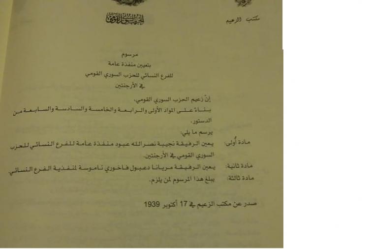 مادة اولى: تعيين الرفيقة نجيبة نصرالله عبود منفذة عامة للفرع النسائي للحزب السوري القومي في الارجنتين