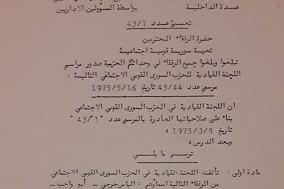ان اللجنة القيادية في الحزب السوري القومي الاجتماعي بناء على صلاحياتها الصادرة بالمرسوم عدد "1/43" تاريخ 8/3/1975 ،