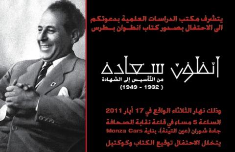 بدعوة من مكتب الدراسات العلمية يقام حفل توقيع كتاب انطوان بطرس "انطون سعاده من التأسيس حتى الشهادة 1932-1949 " وذلك نهار الثلاثاء الواقع في 17 ايار 2011 الساعة 5 مساءً في قاعة نقابة الصحافة جادة شوران (عين التينة). بناية Monza Cars