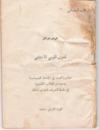 2-اعادة طبع المحاضرة التي كان القاها الامين محمد بعلبكي (وكان رئيسا للمجلس الاعلى) في الجامعة اليسوعية في شهر كانون الثاني 1961، بدعوة من الطلاب الجامعيين، في سلسلة التعريف بأحزاب لبنان.